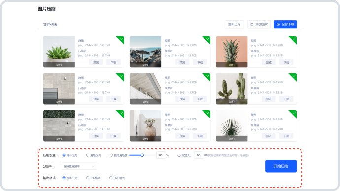 根据预期需求设置图片修改的参数,点击“开始压缩”